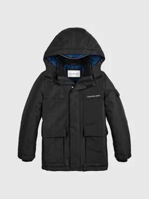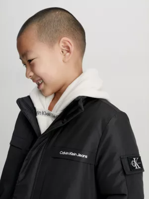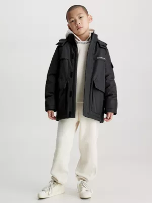 Cette parka matelassée est entièrement confectionnée en polyester recyclé.